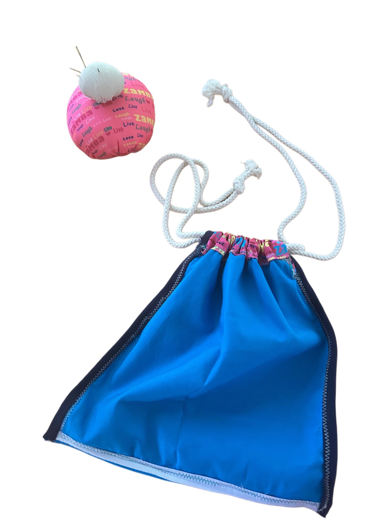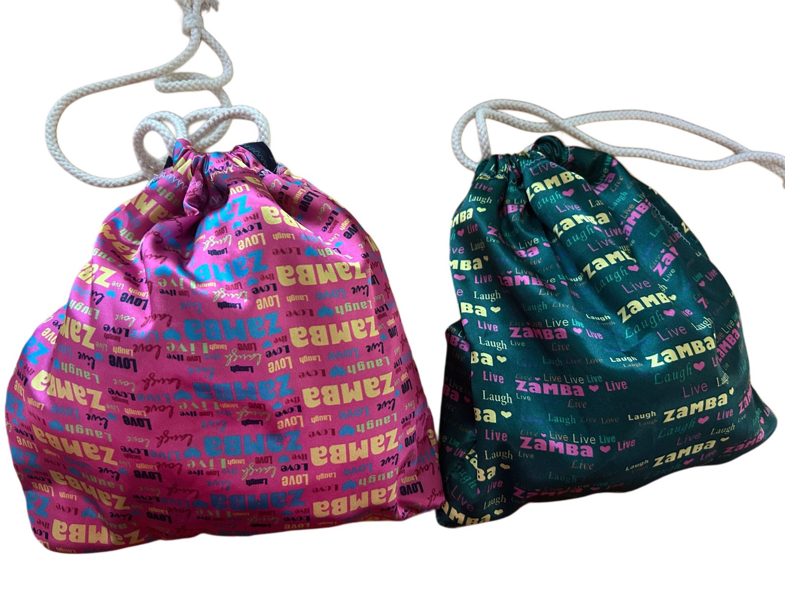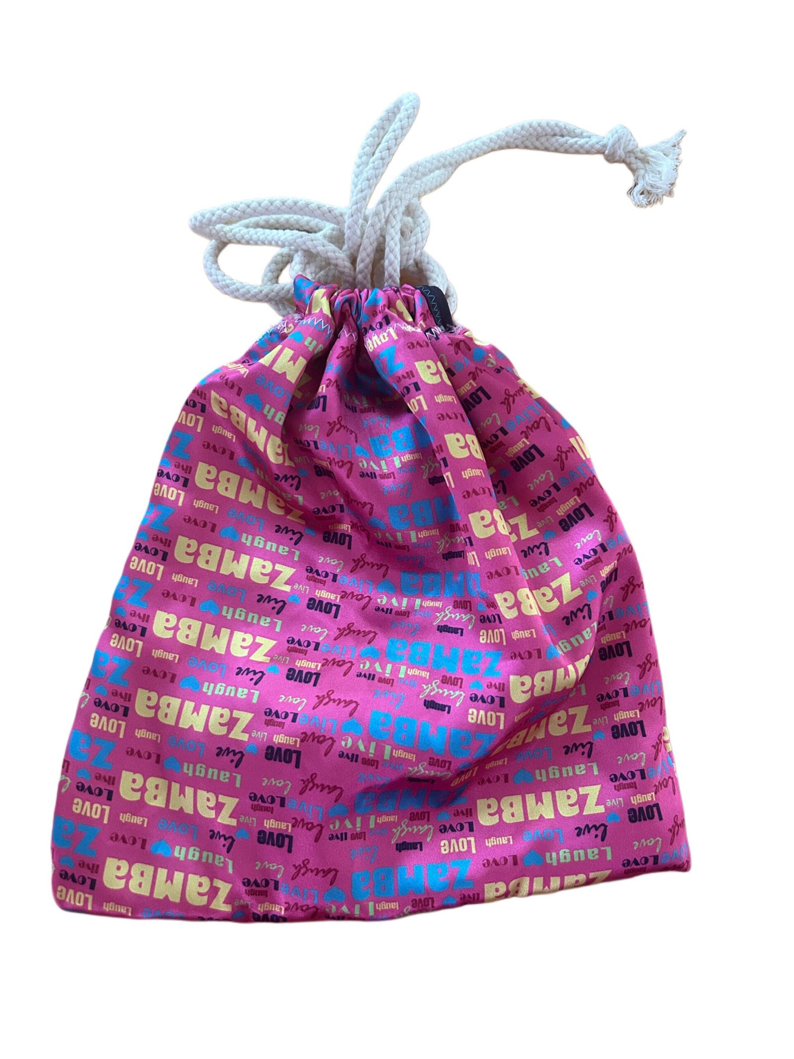 This handcrafted Zambausa drawstring bag features a satin outer layer with joyful “Zamba” prints and a 100% cotton lining, making it soft, breathable, and reversible. Finished with thick 100% cotton rope ties 82″ for durability and style.